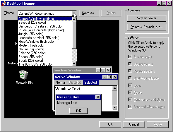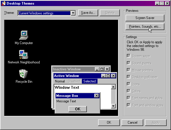 Here you can setup complete themes on your desktop,inclueding sound and mouse pointers.